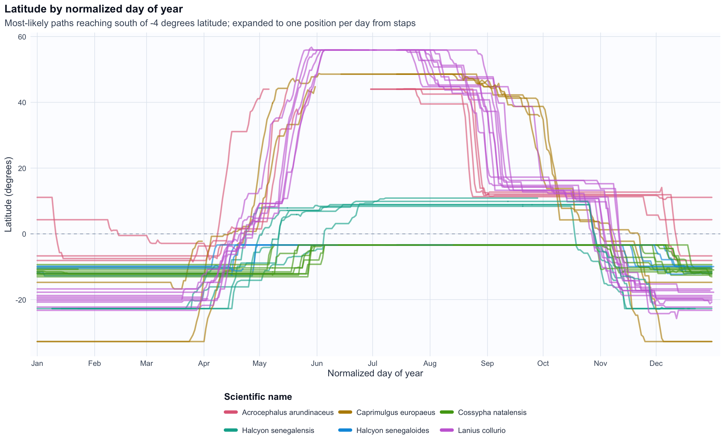 south_tag_ids<-paths(pkgs)%>%filter(type=="most_likely", !is.na(lat))%>%group_by(tag_id)%>%summarize(min_lat =min(lat, na.rm =TRUE), .groups ="drop")%>%filter(min_lat<=-4)%>%pull(tag_id)daily_latitude<-paths(pkgs)%>%filter(type=="most_likely", tag_id%in%south_tag_ids)%>%select(tag_id, stap_id, lat)%>%inner_join(staps(pkgs)%>%select(tag_id, stap_id, start, end), by =c("tag_id", "stap_id"))%>%inner_join(tags(pkgs)%>%select(tag_id, scientific_name), by ="tag_id")%>%mutate( scientific_name =coalesce(scientific_name, "Unknown species"), start_day =as.Date(start, tz ="UTC"), end_day =as.Date(end-lubridate::seconds(1), tz ="UTC"), end_day =if_else(end_day<start_day, start_day, end_day))%>%mutate(date =purrr::map2(start_day, end_day, ~seq(.x, .y, by ="day")))%>%tidyr::unnest(date)%>%arrange(tag_id, date, stap_id)%>%distinct(tag_id, date, .keep_all =TRUE)%>%group_by(tag_id)%>%mutate( doy_norm =yday(date), new_segment =row_number()==1L|doy_norm<lag(doy_norm, default =first(doy_norm)), segment_id =cumsum(new_segment))%>%ungroup()species_levels<-daily_latitude%>%distinct(scientific_name)%>%arrange(scientific_name)%>%pull(scientific_name)species_palette<-setNames(grDevices::hcl.colors(length(species_levels), palette ="Dark 3"),species_levels)daily_latitude%>%ggplot(aes( x =doy_norm, y =lat, color =scientific_name, group =interaction(tag_id, segment_id, drop =TRUE)))+geom_hline( yintercept =0, color ="#94a3b8", linewidth =0.4, linetype ="dashed")+geom_line(alpha =0.62, linewidth =0.9, lineend ="round")+scale_color_manual(values =species_palette)+scale_x_continuous( limits =c(1, 366), breaks =c(1, 32, 60, 91, 121, 152, 182, 213, 244, 274, 305, 335), labels =month.abb, expand =expansion(mult =c(0.01, 0.01)))+labs( title ="Latitude by normalized day of year", subtitle ="Most-likely paths reaching south of -4 degrees latitude; expanded to one position per day from staps", x ="Normalized day of year", y ="Latitude (degrees)", color ="Scientific name")+guides( color =guide_legend( nrow =2, byrow =TRUE, override.aes =list(alpha =1, linewidth =2)))+theme_geolocator_modern(base_size =12)+theme( legend.position ="bottom", legend.title.position ="top", legend.box ="horizontal")