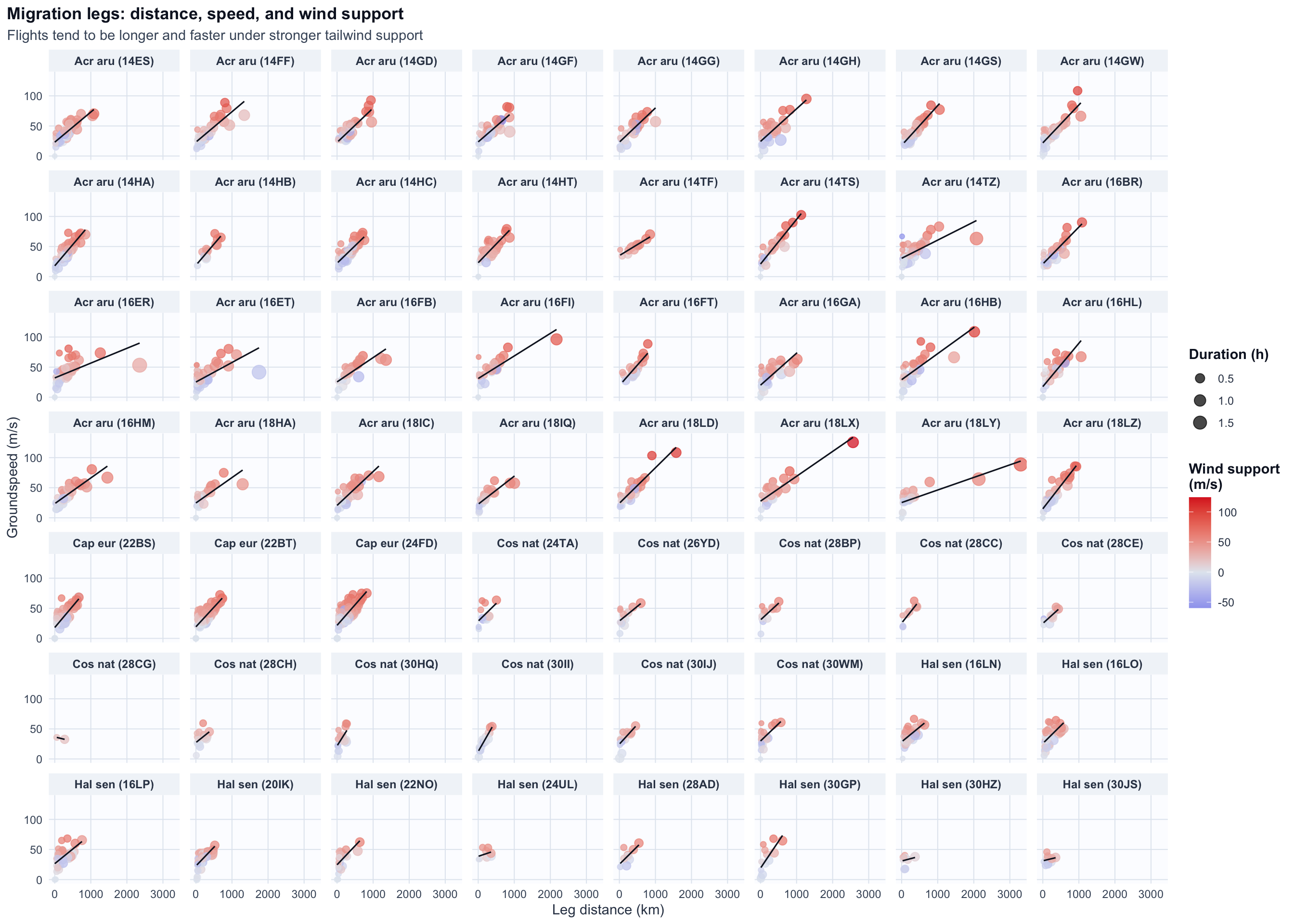 edge_metrics<-edges(pkgs)%>%filter(type=="most_likely")%>%left_join(tags(pkgs), by ="tag_id")%>%mutate( facet_label =paste0(str_replace_all(scientific_name, "\\b(\\w{1,3})\\w*", "\\1")," (",tag_id,")"), duration_h =stap2duration(.), groundspeed =sqrt(gs_u^2+gs_v^2), windspeed =sqrt(ws_u^2+ws_v^2), wind_support =(gs_u*ws_u+gs_v*ws_v)/pmax(windspeed, 1e-6))%>%filter(!is.na(wind_support))edge_metrics%>%ggplot(aes( x =distance, y =groundspeed, color =wind_support, size =duration_h))+geom_point(alpha =0.72)+geom_smooth(aes(x =distance, y =groundspeed), method ="lm", se =FALSE, color ="#111827", linewidth =0.55, inherit.aes =FALSE)+facet_wrap(~facet_label, ncol =8)+scale_color_gradient2( low ="#2563eb", mid ="#e2e8f0", high ="#dc2626", midpoint =0, name ="Wind support\n(m/s)")+scale_size(range =c(1.2, 4.8), name ="Duration (h)")+labs( title ="Migration legs: distance, speed, and wind support", subtitle ="Flights tend to be longer and faster under stronger tailwind support", x ="Leg distance (km)", y ="Groundspeed (m/s)")+theme_geolocator_modern(base_size =11)+theme( panel.spacing =grid::unit(0.55, "lines"), strip.text =element_text(size =9), legend.position ="right")