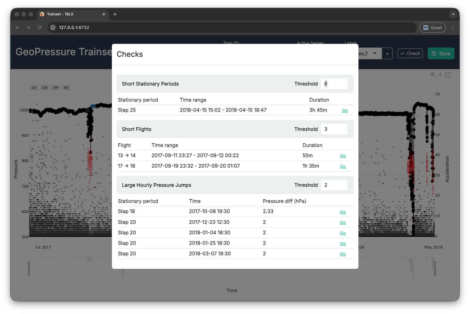 Use the Go button on each warning row to jump directly to the relevant period/time window, inspect, relabel, and re-check.